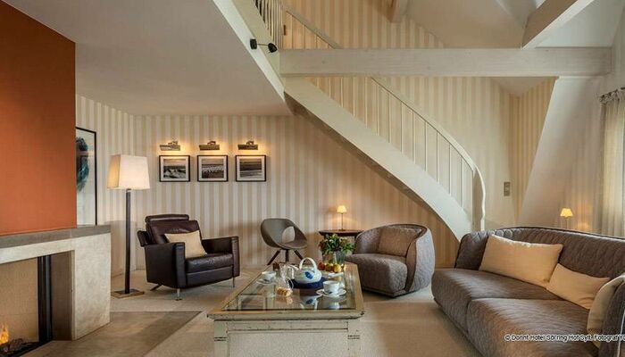 Alors que le feu flambe dans la cheminée, vous pouvez profiter d‘une vue imprenable sur la plage et la mer du Nord depuis le salon de notre suite exclusive et spacieuse.