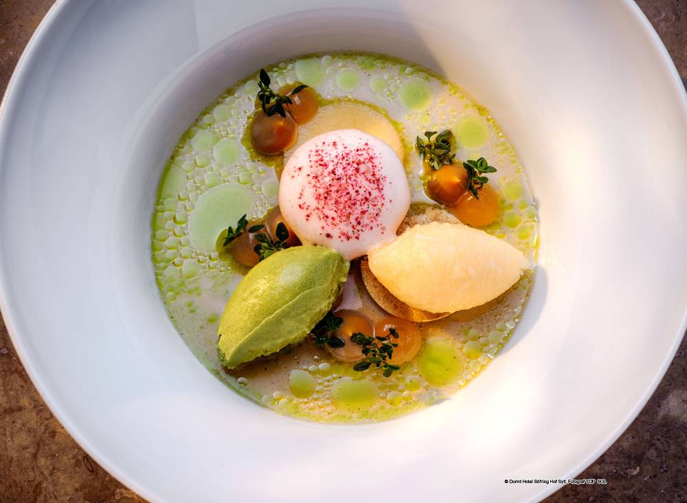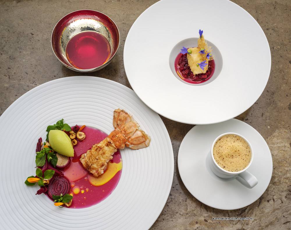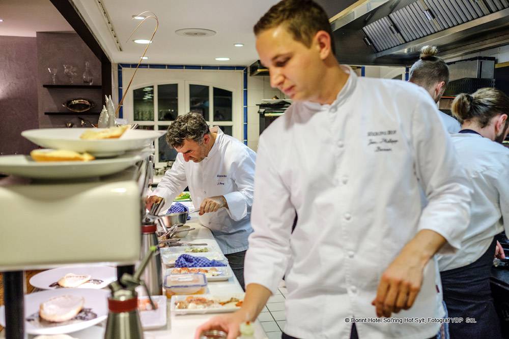 Johannes King et le chef Jan-Philipp Berner, membre des Jeunes Restaurateurs, s‘appuient sur des produits simples et honnêtes. Orienté sur les saisons, le restaurant sert principalement des ingrédients régionaux. Et au moment de choisir leurs produits, les deux ne laissent rien au hasard: les légumes, les fruits et les herbes viennent de l‘arrière-pays local, le poisson et les fruits de mer nous fournissent des pêcheurs de la région. Vous pouvez également profiter de l‘unique Sylter Royal Oyster. La seule huître d‘Allemagne vient de la ruse de la Compagnie des Huîtres de Dittmeyer.