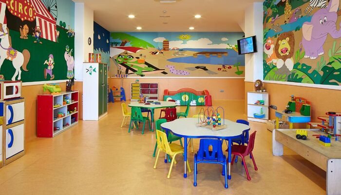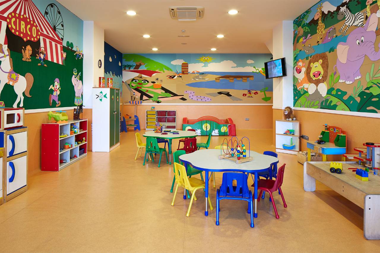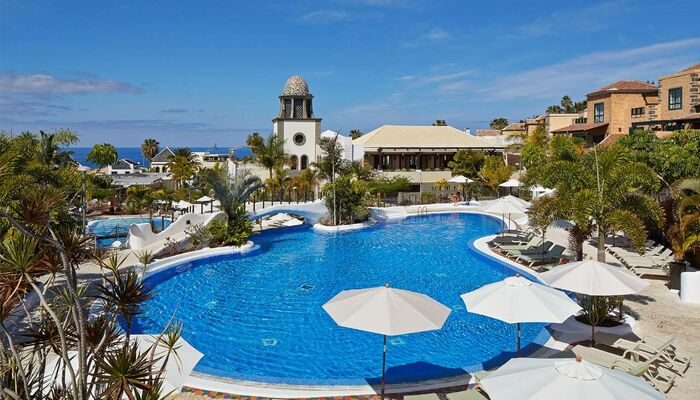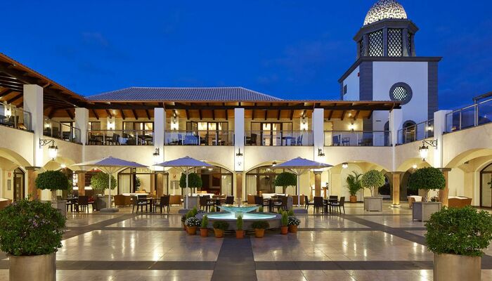 Le bâtiment principal, dominé par une grande place avec sa tour et sa fontaine centrale, abrite les services communs de l`hôtel: la réception, le Bar Plaza, le restaurant La Torre, la salle de jeux vidéo, le mini-club pour enfants, le coiffeur et le mini-marché avec produits typiques de l`île. L`hôtel dispose de deux piscines d`eau douce de type lagon, chauffées en hiver et reliées par une belle cascade, en plus d`une piscine pour enfants. Autour d`eux il y a un grand solarium et la piscine