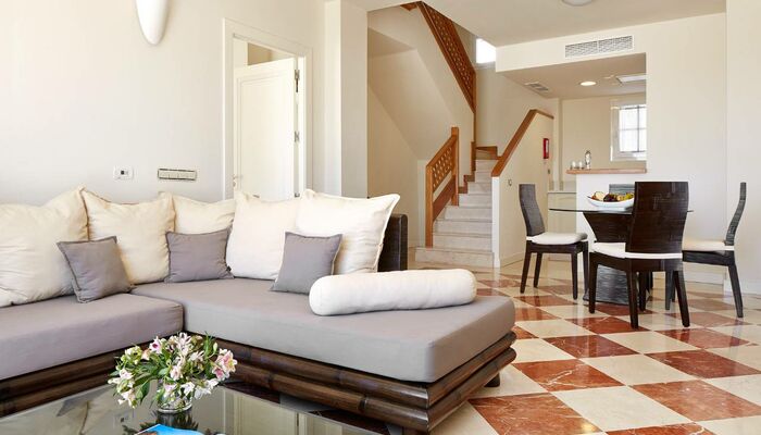 L`hôtel dispose de villas pouvant accueillir entre 2 et 6 personnes, toutes réparties sur deux étages. Au rez-de-chaussée se trouve la cuisine, entièrement équipée avec des ustensiles de cuisine complets, une plaque vitrocéramique, un réfrigérateur / congélateur, un four micro-ondes, un four, une cafetière et une bouilloire. Il comprend un salon spacieux avec des canapés confortables et une télévision par satellite avec chaînes internationales. Chaque villa dispose, au minimum, de deux salles de bains, toutes deux équipées d`une douche d`hydromassage, ainsi que d`une grande baignoire et de lumière naturelle dans la salle de bain située à l`étage supérieur. À l`extérieur, chaque villa dispose d`une grande terrasse à l`étage supérieur ou d`un balcon avec une vue fantastique sur la mer, et au rez-de-chaussée, une magnifique