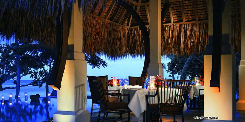 Le restaurant de l'Oberoi, à Maurice, présente un toit en bois de chaume et une vue panoramique sur l'océan Indien. Dînez à l'intérieur parmi les piliers ou à l'extérieur sous les étoiles sur un menu fabuleux composé de plats européens, orientaux et créoles, reflétant la saveur multiculturelle de l'île et présentant des fruits, des légumes et des épices frais locaux. Avec des fleurs exotiques, des bougies qui scintillent à la surface de la piscine, l'étrange chant du soir des grenouilles et les couchers de soleil spectaculaires, vous pourriez être pardonné de penser que vous êtes allé au paradis.